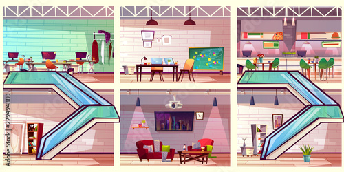 View Empty Office Room Cartoon Pictures. Modern workplace office room interior flat cartoon. Computer class, open space office empty interior.